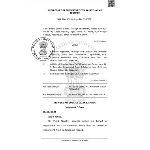 सिरोही माननीय राजस्थान उच्च न्यायालय जोधपुर ने सेवा भारती समिति, सिरोही के प्रकरण में प्रार्थी के अधिवक्ता एवं नगर पालिका के अधिवक्ता को सुनने के पश्चात नगरपालिका सिरोही द्वारा प्रस्तावित रामझरोके के पास भूखड़ को नीलाम करने पर अंतरिम रोक लगाते हुए 12 /13 जनवरी 2021 को प्रस्तावित नीलामी को अंतिम करने से रोकने का आदेश पारित किया।