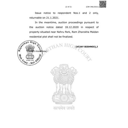 राजस्थान हाईकोर्ट के आदेशानुसार निलामी प्रक्रिया होगी, लेकिन इसे फाइनल नहीं किया जाएगा। यानि कि इसका कब्जा सुपुर्दगी आदि की कानूनी प्रक्रिया 21 जनवरी की सुनवाई के बाद के निर्णय पर निर्भर होगा।